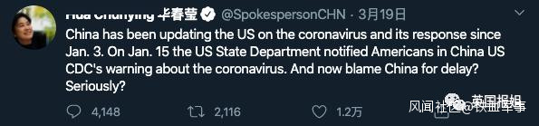 “自1月3日以來,中國一直在向美方提供新冠病毒以及應對措施的最新信息。1月15日的時候美國國務院也通知了中美疾控中心的美國人有關新冠病毒的警告。現在反咬一口指責中國拖延?這是認真的嗎?”
