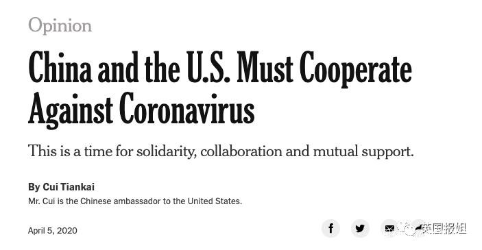 在全球疫情緊張的情況之下,中國駐美大使崔天凱5號的時候在紐約時報發表文章: 《中國與美國應該合力對抗新冠病毒》