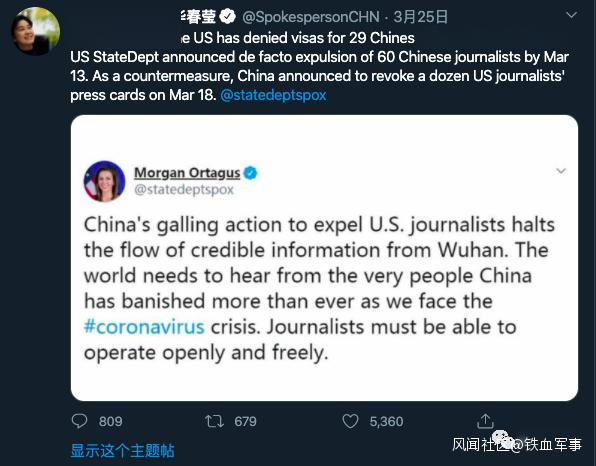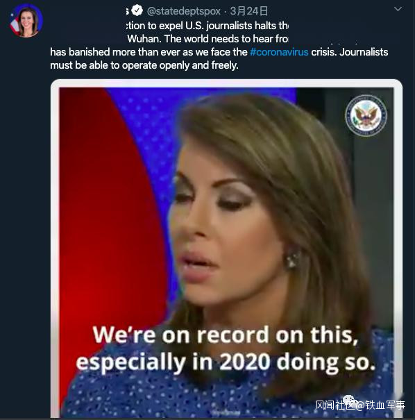3月24日,Morgan Ortagus又開始拿中國驅逐美國記者説事,她表示這麼做“嚴重阻礙了疫情的重要信息從武漢傳出”、“記者需要更公開和自由的空間。”