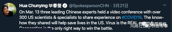 “中國是第一個與世衞組織和其他國家分享病毒數據和報告的國家,包括兩名美國專家在內的世衞組織聯合訪問團已經訪問了武漢,並對中國做出的努力表示讚賞。華盛頓啥時候邀請國際專家團隊來美國進行調查呢?”