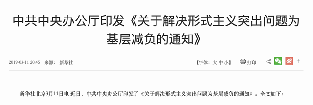 去年3月,中辦就曾印發《關於解決形式主義突出問題為基層減負的通知》,2019年也被定為了“基層減負年”。