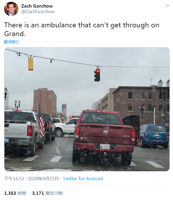CNN新聞4月15日報道,密歇根州的抗議者開車將街道堵住,以示對居家隔離政策的抗議。