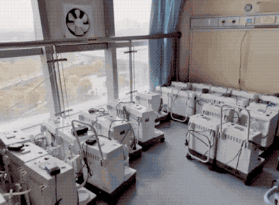 4月初,雷神山醫院閒置下來的搶救儀器排列在一起,將被消毒清洗。