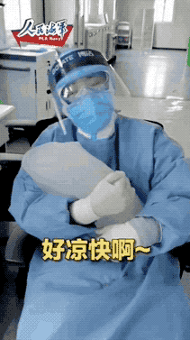 另一位火神山的護士為腦梗患者導尿後,為了讓自己快速降温消暑,直接抱起了冰塊。