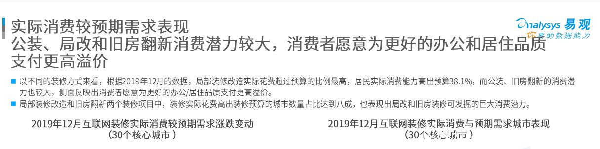 據《中國互聯網裝修行業指數洞察2020》報告顯示,“在2019年12月30個核心城市互聯網全屋盯住需求價格指數當中,其中有21個城市環比下跌,可以説,中國互聯網全屋定製需求指數目前總體偏低,整體消費能力有待挖掘。”