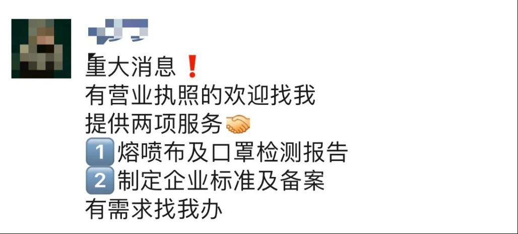 更有中間商看到商機,還專門做起了幫助企業註冊、辦理熔噴布檢測報告的生意。
