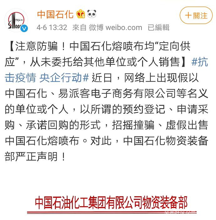 按照政府統籌,中國石化熔噴布全部定向供應口罩廠製作口罩,不對其他企業和個人銷售,防止中間商囤積投機倒把賺差價。凡是以中石化員工名義或者打着中石化名義出售熔噴布的,全部為招搖撞騙,大家注意,歡迎舉報。