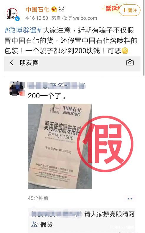 4月16日午間,中國石化官方微博發佈了一條闢謠信息,稱近期有騙子不僅假冒中國石化的貨,還假冒中國石化熔噴料的包裝,一個袋子都炒到200塊錢。