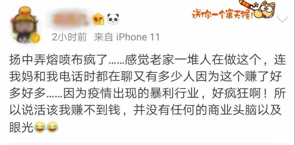 而在各大渠道商信息圈中,熔噴布的訂購需求更是圍繞揚中展開。不少揚中的網友在微博上説:“揚中弄熔噴布瘋了,感覺老家一堆人在做這個”,“做熔噴布簡直就是印鈔機”……