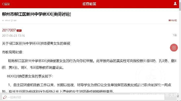 2017年6月23日,有人將一則《關於柳江區某中學XXX涉嫌侵害女生的舉報》消息,發在廣西本地社區論壇上。