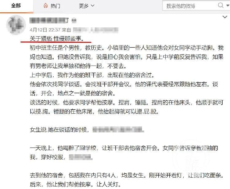 ▲4月12日,廣西柳州女生蘇南在微博舉報初中班主任性侵、猥褻學生。微博截圖