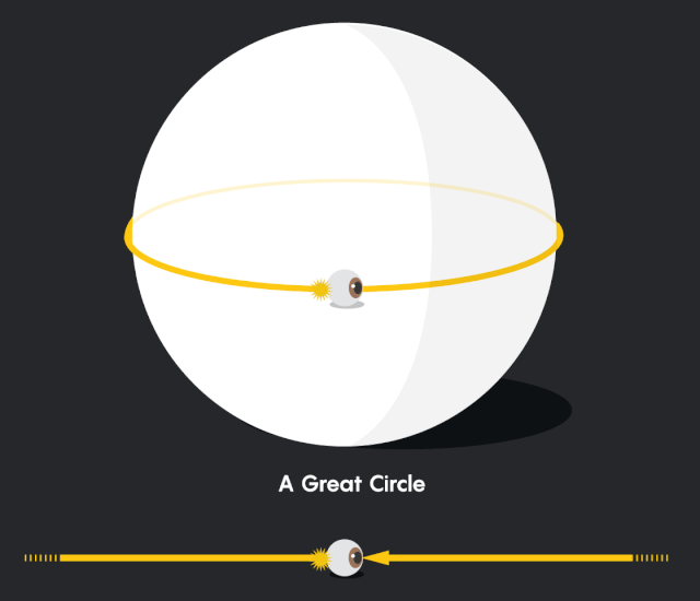 在三維球面上的生活和在平坦空間裏的生活感覺非常不同。為了感受一下,想象你是一個生活在二維球面上的二維生物。二維球面就是整個宇宙——你無法看到或進入周圍的任何三維空間。在這個球面宇宙中,光沿着最短的可能路徑傳播:大圓。對你來説,這些大圓就像直線。