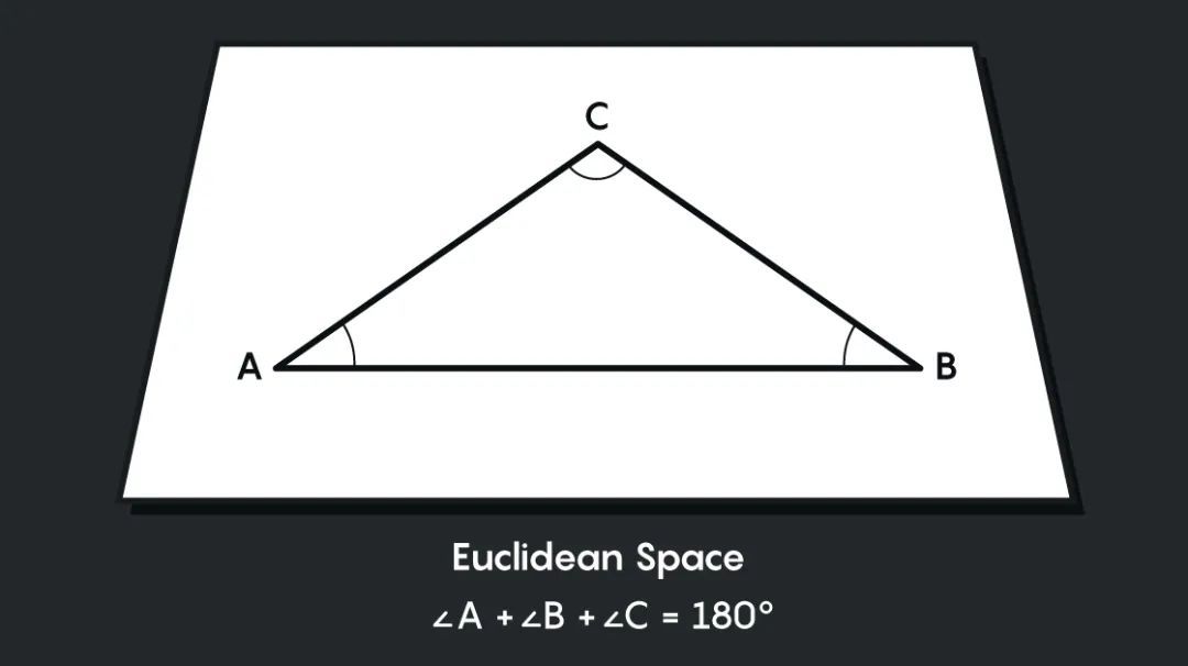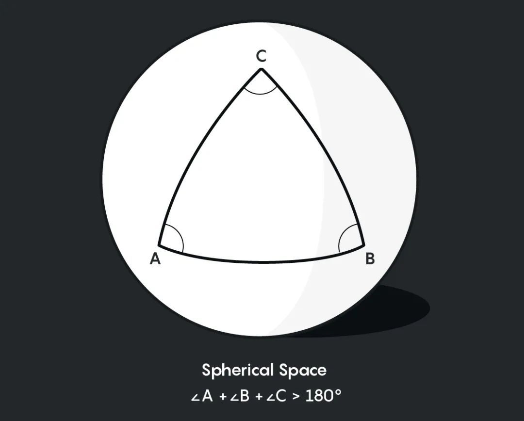 但我們不能排除我們生活在一個球面世界或雙曲世界的可能性,因為這兩個世界在小範圍看起來幾乎是平坦的。例如,在球面幾何中,小三角形的內角和僅略大於180度,而在雙曲幾何中,小三角形的內角和僅略小於180度。