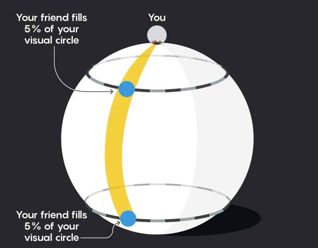 但是一旦你的朋友越過赤道,奇怪的事情就發生了:他們離你越遠,看起來就會越來越大。這是因為他們在你的視野範圍內所佔的比例在增加:
