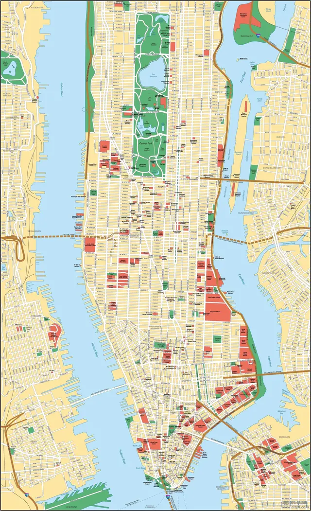 曼哈頓島是長條形的,其中部和北部地區,即紐約的中城,道路規劃得很好,都是棋盤式佈局。