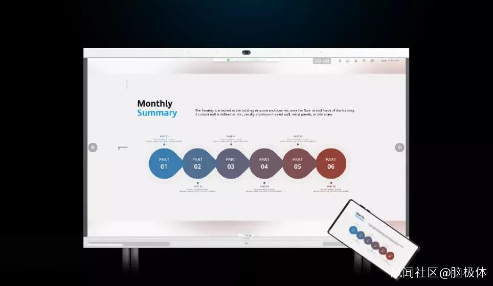 基於企業智慧屏,可以實現大屏、手機、電腦的多屏協同辦公,NFC一碰傳導文件,實現設備之間、團隊人之間隨時共享文件、實現無縫投屏,讓會議和討論清晰流暢。同時它又可以是智能電子白板,遠程協作系統,視頻會議中心,並可以在華為雲WeLink生態和華為應用市場中升級更多功能。