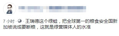 對此,在臉書上,有網友表示,王瑞德把全球第一的糧食安全國新加坡説成要斷糧,這就是綠營媒體人的水準。