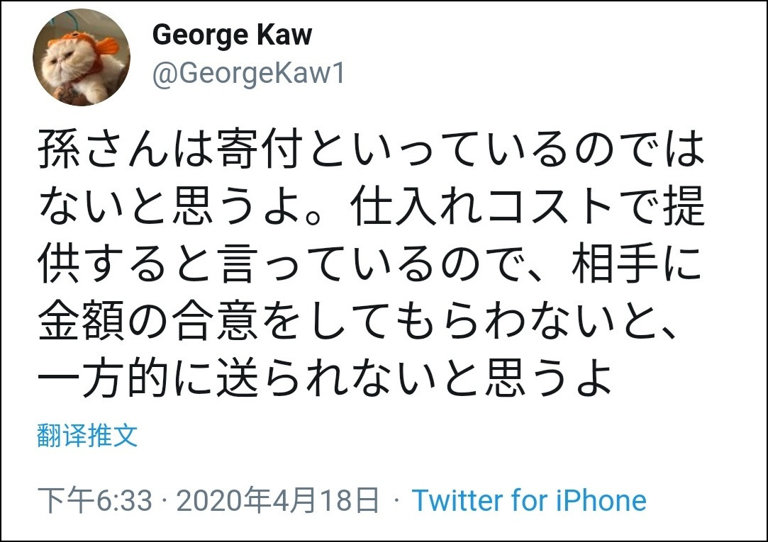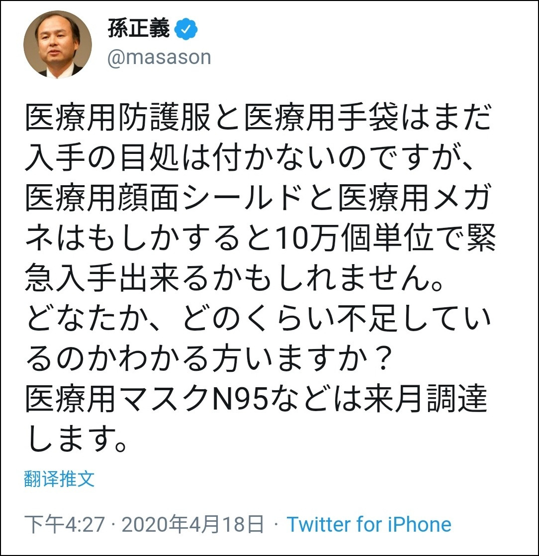4月18日下午,孫正義在推特上發文,稱自己籌集到10萬件的防護面罩和護目鏡,想詢問有哪個地方是需要這些物資的。