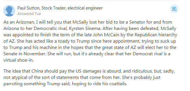 隨後瑪莎·麥克薩利(Martha McSally)提議中國免除持有的美國國債以賠償因傳播冠狀病毒並隱瞞了真相對美國造成的損失……