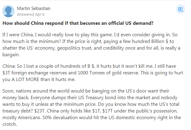 如果我是中國人,我真的很樂意玩這個遊戲。我甚至會考慮做出讓步。那麼最低價格是多少?如果價格合適,花幾千億美元來粉碎美國經濟、地緣政治信任以及公信力,一勞永逸,還真是划算。