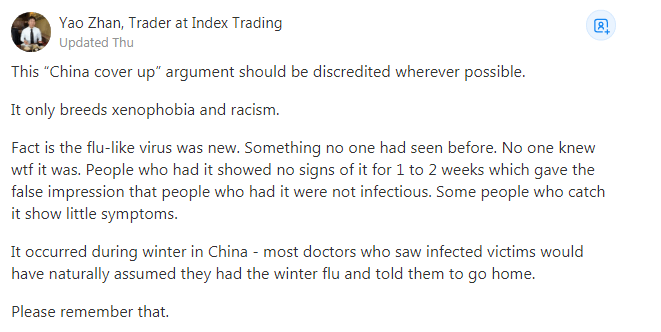 他們認為中國人瘋了,沒必要如此驚慌失措。現在,那些説這只是一場“流感”,稱整個事件被“過度炒作”,稱中國的反應太過“激烈”,對中國的報道不屑一顧的人,都在指責中國掩蓋事實。