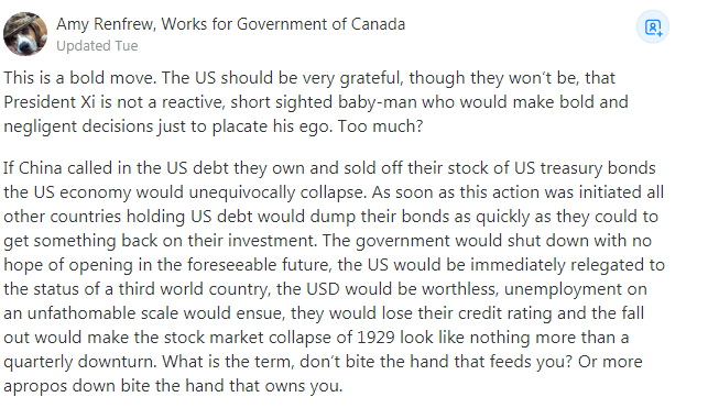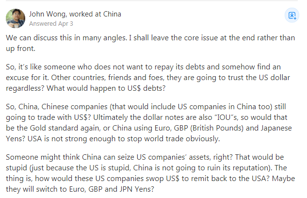 有人可能會認為,中國可以沒收美國公司的資產,對吧?那就太愚蠢了(僅僅因為美國的愚蠢,中國不會自毀聲譽)。問題是,這些美國公司要如何把這些美元匯回美國?或許他們會兑換成歐元、英鎊和日元?