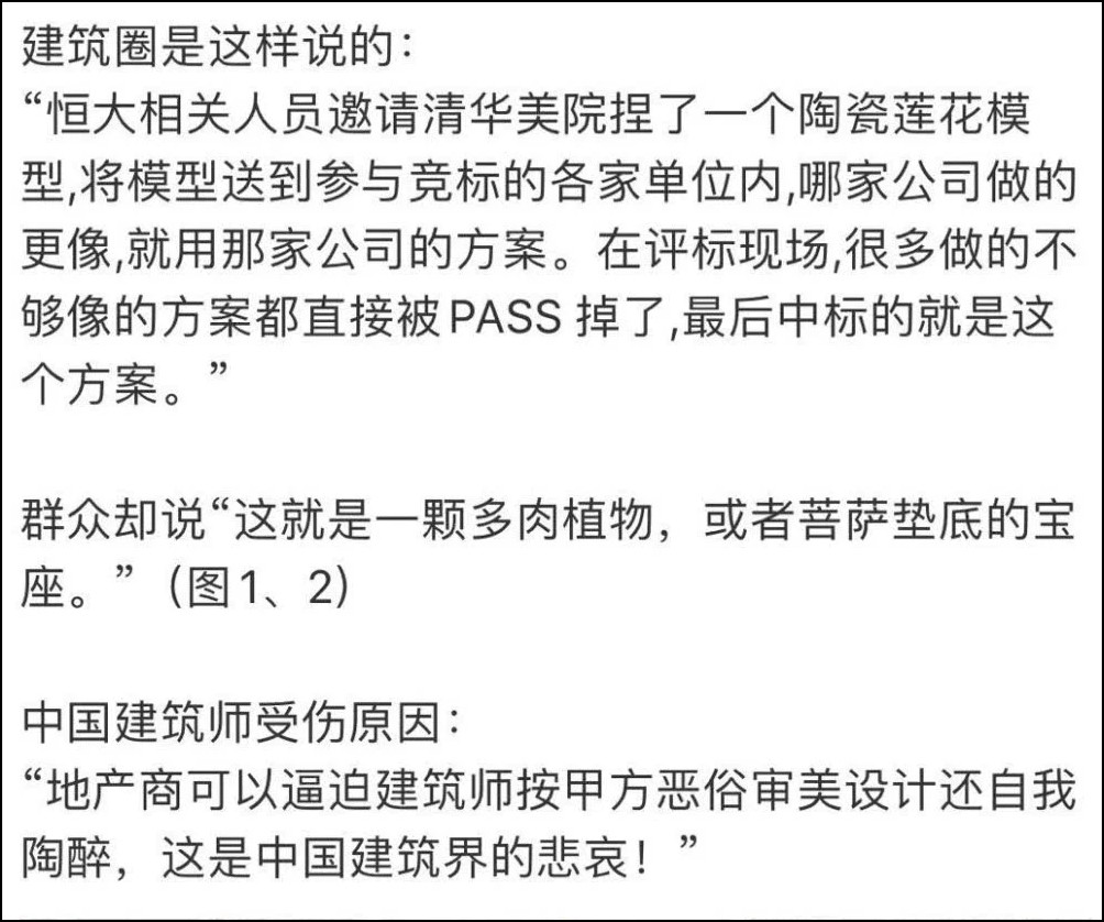 這位華中科大教授還透露,恒大相關人員邀請清華美院捏了一個陶瓷蓮花模型,將模型送到參與競標的各家單位內,哪家公司做的更像,就用那家公司的方案。在評標現場,很多做的不夠像的方案都直接被PASS掉了,最後中標的就是這個方案。