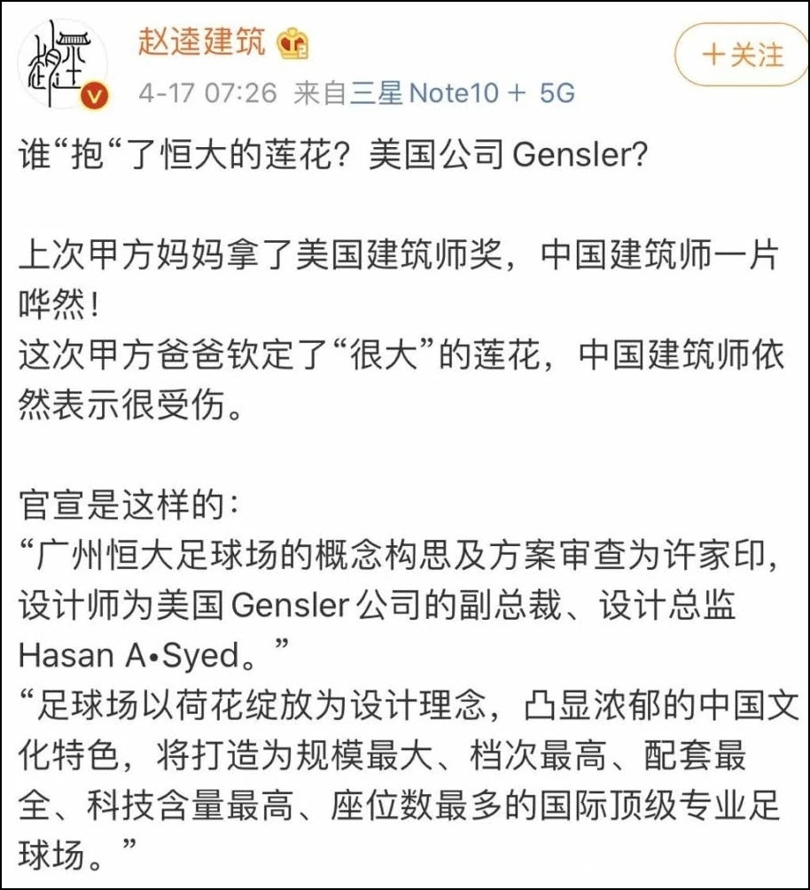 趙逵是這樣説的:“上次甲方媽媽拿了美國建築師獎,中國建築師一片譁然!這次甲方爸爸欽定了很大的蓮花,中國建築師依然表示很受傷。”