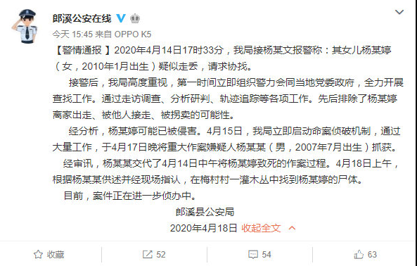 心痛,又一起!安徽郎溪失蹤的10歲女孩遇害,13歲嫌疑少年已被抓獲_風聞