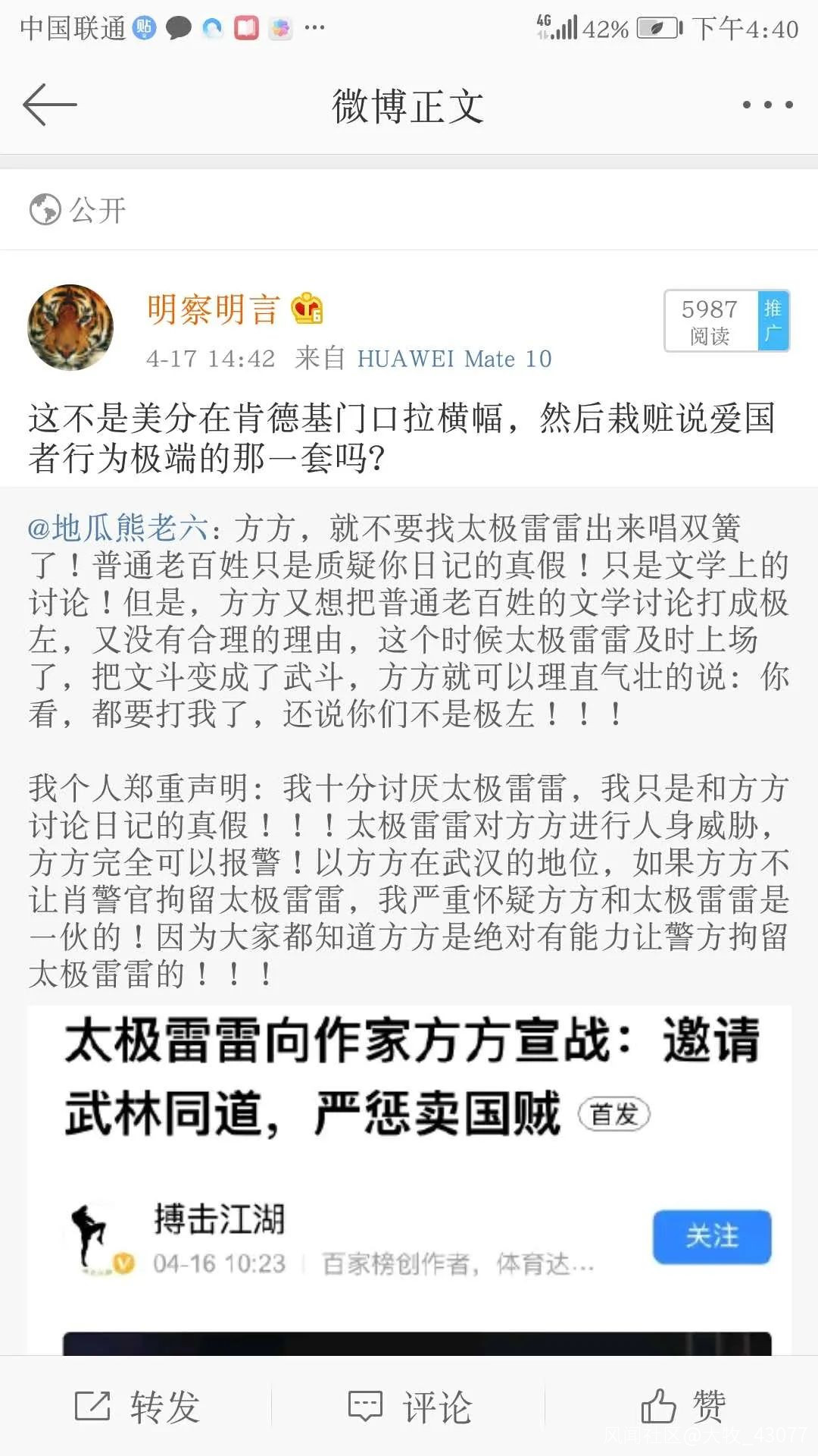 還有一件事,是一個叫太極雷雷的人,製作視頻向方方宣戰,併發到網上。方方發現後,立即把相關文章當寶貝發到了微博。