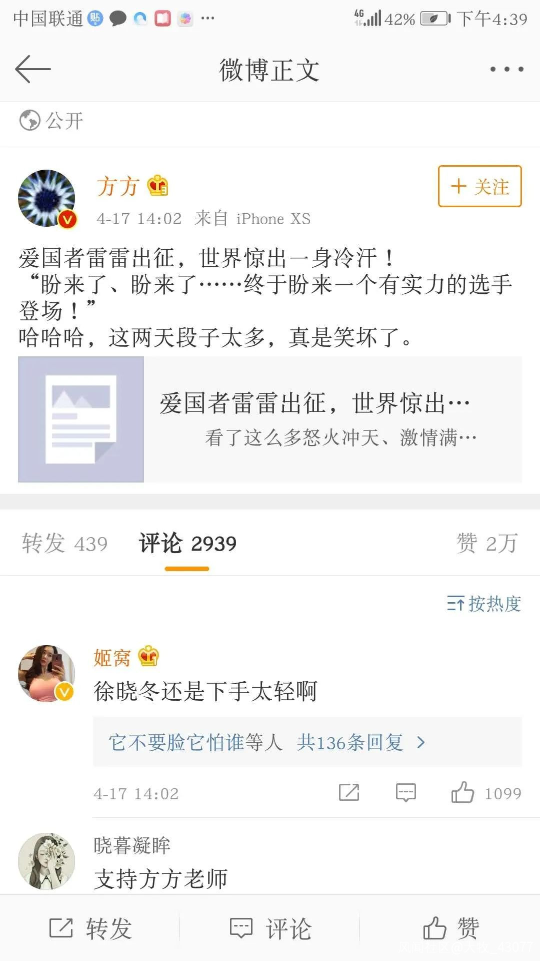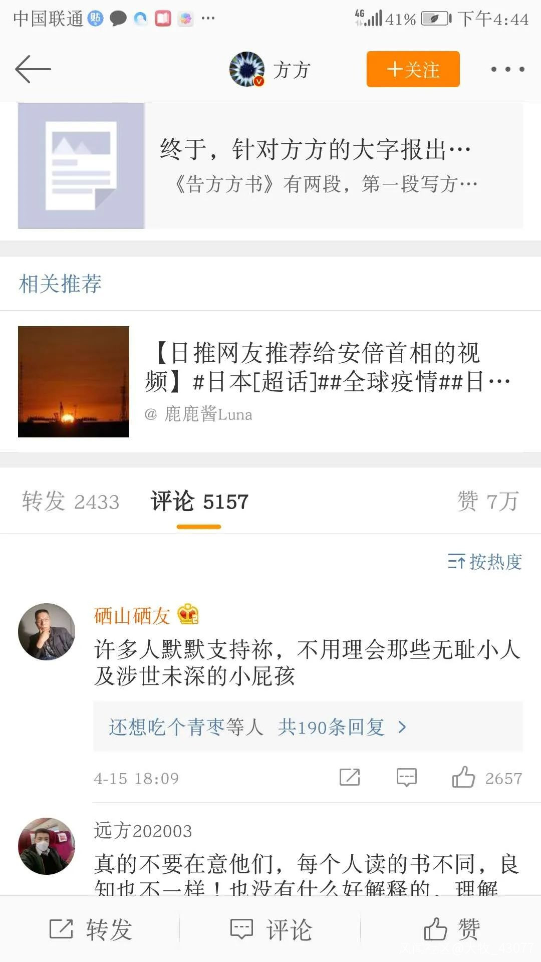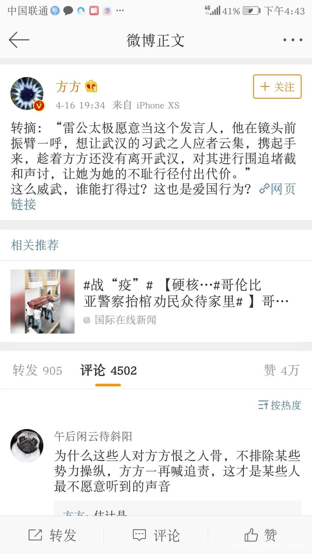 注意一下方方的微博,除了轉發支持她的文章之外, 早就有網友發現,方方把評論區很多講理的批評她的評論都刪除了,唯獨對她人身攻擊和威脅的評論留着不刪(我並不是説那些留下的評論都是這樣的,因為有理有據的評論太多,方方刪也刪不完,只是説方方的團隊很懂控評策略)。