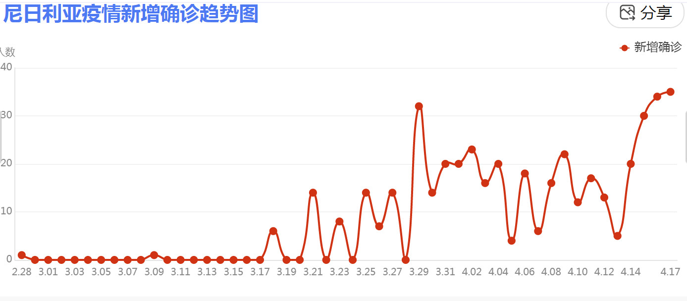 據尼日利亞疾控中心統計,4月17日,新增51例,累計493例,治癒7例,累計治癒159例,死亡4例,累計死亡17例。拉各斯和首都阿布賈的病例佔71%。