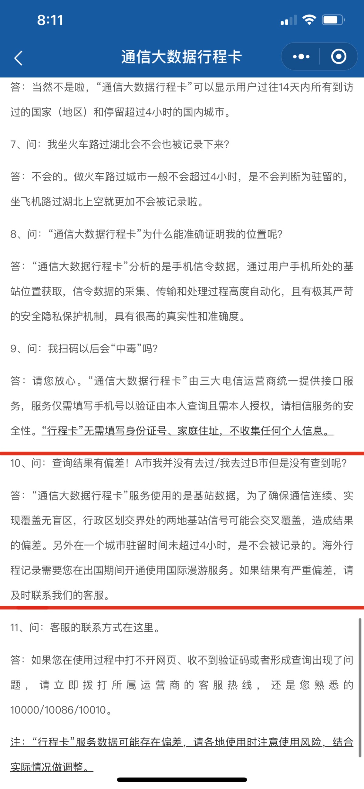 記者查詢發現,工信部信息通信管理局聯合三大運營商推出的“疫情防控通訊大數據行程卡”使用説明中,也對“查詢結果有偏差”做了詳細説明:“通信大數據行程卡”使用的是基站數據,為了確保通信連續、實現覆蓋無盲區,行政區劃交界處的兩地基站信號可能會交叉覆蓋,造成結果的偏差。另外,在一個城市駐留時間未超過4小時,是不會被記錄的。如果結果出現嚴重偏差,可聯繫所屬運營商的客服熱線。
