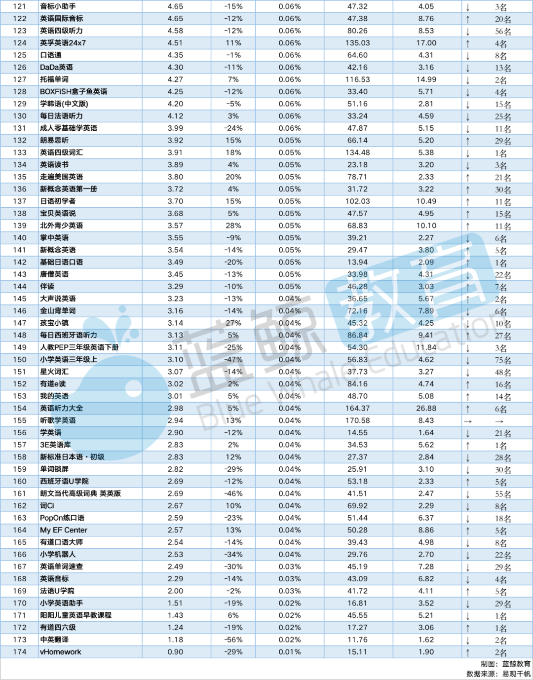 藍鯨教育智庫將持續跟進在線外語學習APP排行榜的用户情況,呈現更多教育領域的排行榜。