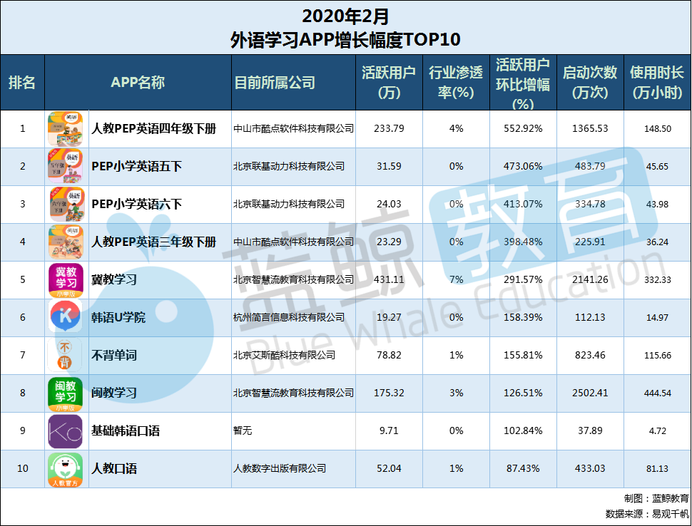 首先是2020年2月末用户規模漲幅TOP 10榜單,增幅前十的APP分別是:“人教PEP英語四年級下冊”、“PEP小學英語五下”、“PEP小學英語六下”、“人教PEP英語三年級下冊”、“冀教學習”、“韓語U學院”、“不背單詞”、“閩教學習”、“基礎韓語口語”、“人教口語”。