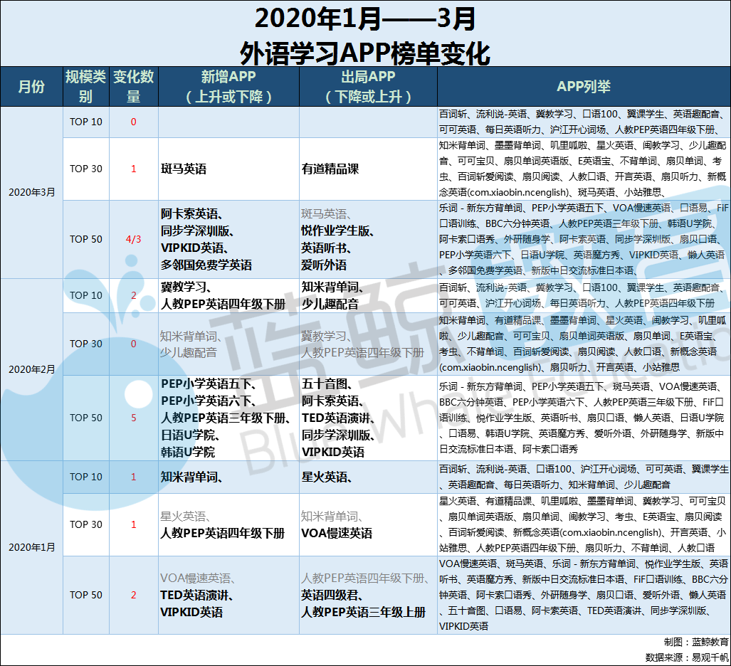 藍鯨教育智庫分別梳理了2020年1-3月外語學習APP的具體榜單變化,以下為“2019年1月--3月在線外語學習APP榜單變化”,標灰色的APP表示從上一級別甩出到下一級別或者從下一級別出去進入上一級別,並不算作該級別新增APP。