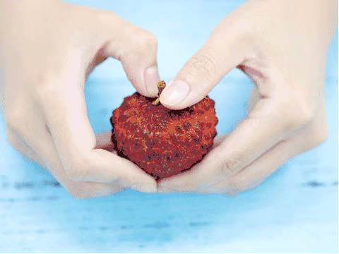 就像宋人蔡襄説荔枝“色澤鮮紫,殼薄而平,瓤厚而盈,膜如桃花紅,核如丁香母,剝之凝如水精,食之消如絳雪”。用詩頌荔枝表達它的嬌嫩欲滴再恰當不過了。