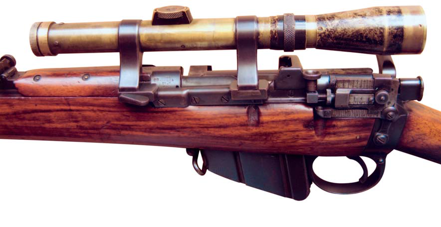 裝備最廣泛的英國狙擊步槍,Mk III SMLE步槍,帶有偏移式PPCo瞄準鏡座,本例中採用了Aldis瞄準鏡。事實證明,這種偏移式設計一直很麻煩,但直到戰爭結束後,P14(T)步槍問世時,這種設計才得到糾正。