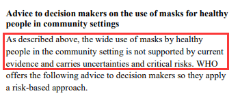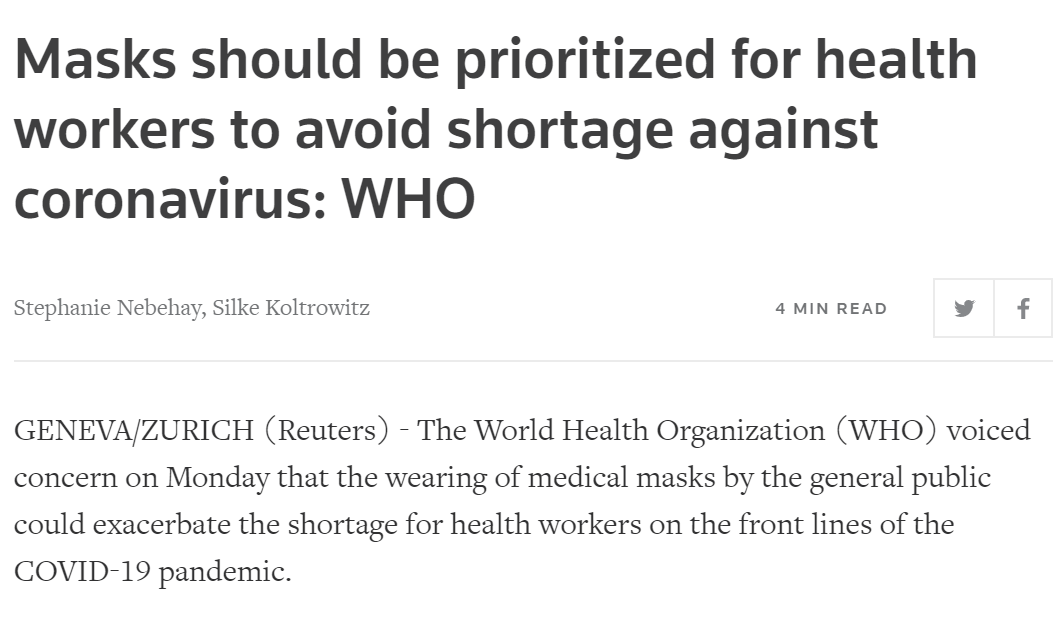 “口罩對公眾沒有用,因為它們提供了錯誤的安全感。 它們不一定能防止感染,並且它們可能會讓人民放鬆,從未不遵循其他建議,比如與他人保持2m的距離並經常洗手等。”