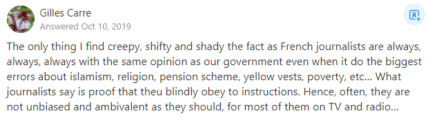 唯一讓我感到毛骨悚然、詭詐和陰暗的是,即使政府在YSL主義、宗教、養老金計劃、黃背心、貧困等問題上犯了最大的錯誤,法國的記者也總是,總是,總是和我們的政府持同樣的觀點……這些記者們所説的證明了他們不過是盲目服從指令。因此,大多數的電視和廣播,並不是我們通常認為的那樣毫無偏見。