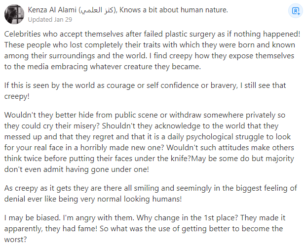 那些在整容失敗後接受自己的名人,他們好像什麼都沒發生過!這些人完全喪失了他們出生時擁有的並在周圍環境和世界中為人所知的特質。我覺得很恐怖,他們怎麼能夠接受把自己變成一個怪物並暴露在媒體的面前?