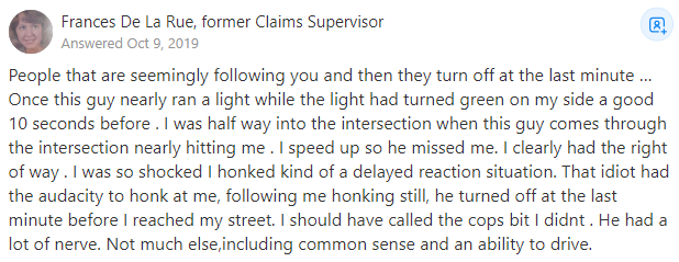 有人似乎在跟蹤你,然後在最後一分鐘停車……有一次,這個傢伙差點闖紅燈,而我身邊的燈在10秒鐘前就變成綠色了。我在十字路口的半路上,突然有個傢伙從十字路口開過,差點撞到我。我加速了,所以他沒撞上,我顯然有通行權,我太震驚了,我反應有點遲鈍。那個白痴竟敢朝我按喇叭,還一直跟着我,在我走到街上的最後一分鐘,他就停車了。我本來應該報警的,但我沒有。他很有膽量,但沒有常識和駕駛能力。