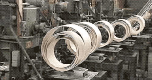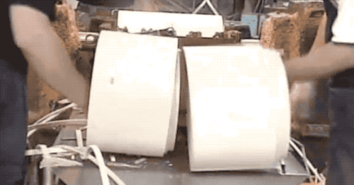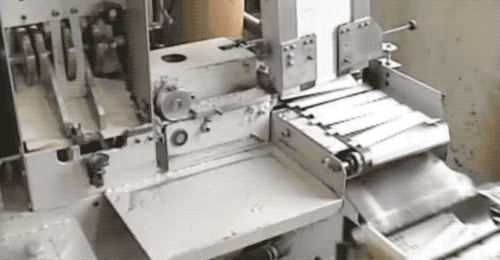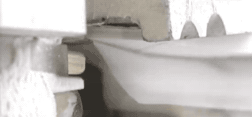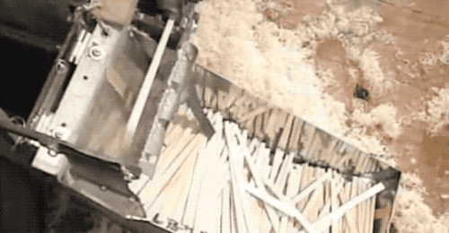 這裏我們看個慢動作,注意看是 3 把刀在裁切,這每 1 次裁切,是切出來 2 雙筷子的。為啥不是 1 次 1 雙呢?因為這樣排列可以獲得最小的材料耗損。