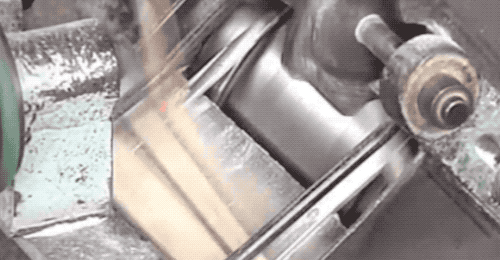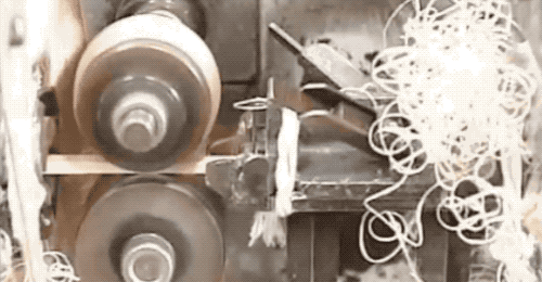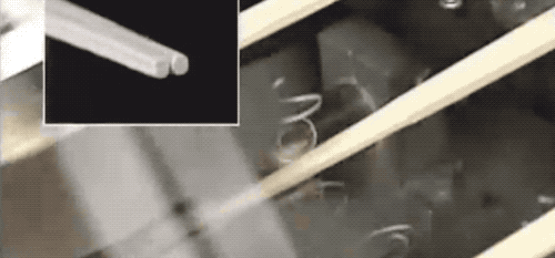 稜角分明的筷子從右邊被推進去,被刨削掉邊角後,再被左邊的兩個輥輪壓住後給扯了出來…