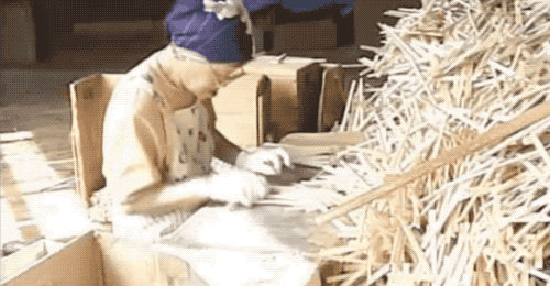 老奶奶要先挑揀出殘次品扔掉,然後在把合格品的筷子尖都朝到一個方向收集好。這之後就到了我們最終處理成一次性筷子的時候~