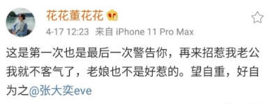4月17日,一位ID為花花董花花的網友在微博向網紅張大奕喊話,“這是第一次也是最後一次警告你,再來招惹我老公我就不客氣了,老孃也不是好惹的。望自重,好自為之。”