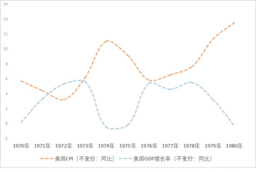 1971年8月佈雷頓森林體系被尼克松政府宣佈結束。接下來因為美元和黃金脱鈎,各個國家把美元換成黃金,美元迴流美國以及和越南的戰爭多發的美元也淤積在美國國內。推高美國國內物價。導火索:1973年,第四次中東戰爭期間,為反制以色列及其支持者,中東主要產油國坐下來一談,決定不賣石油給歐美。