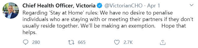 還有一個細節,那就是4月1日,維州警方表示,在執行第三階段的社交禁令時,分居的情侶不可以串門,這是對剛發佈不久的新規定的一個解釋説明。但是維州的首席衞生官員在當日下午表示,考慮到這個政策不太人道,且該行為帶來的大規模傳播風險較低,所以允許分居情侶見面。他的建議很快就得到了採納。