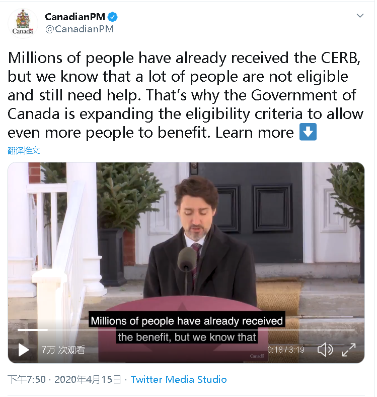 △特魯多總理4月15日宣佈已有數百萬加拿大人收到了政府的疫情應急福利金