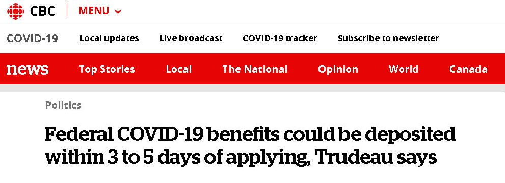 △《特魯多説聯邦疫情福利將在3至5天內發放》——加拿大廣播公司